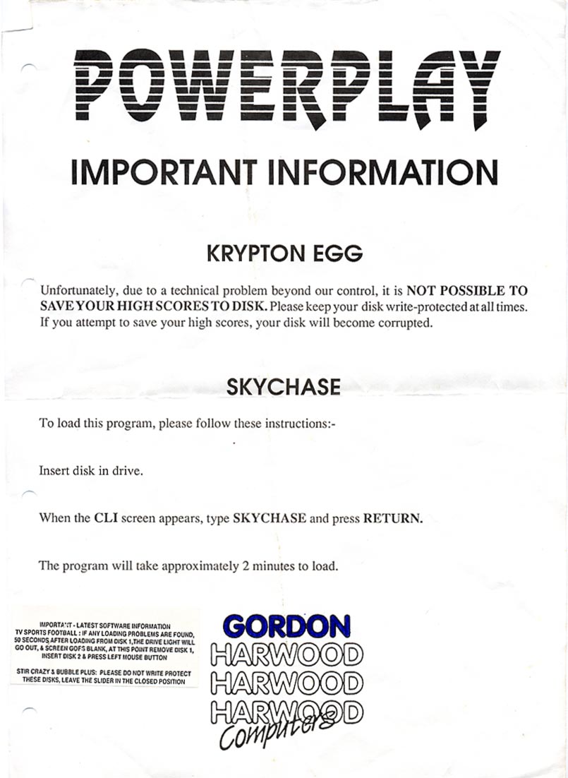 "Unfortunately, due to a technical problem beyond our control, it is NOT POSSIBLE TO SAVE YOUR HIGH SCORES TO DISK. Please keep your disk write-protected at all times. If you attempt to save your high scores, your disk will become corrupted."